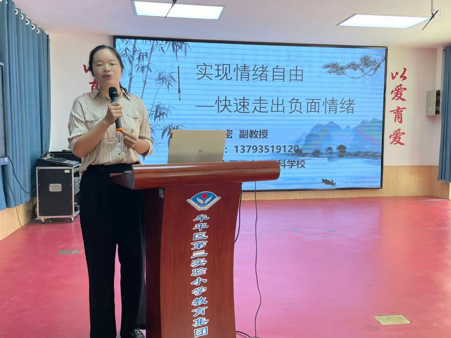 8月,李密老师走进牟平区第二实验小学,为校内教师作了一场题为《实现情绪自由,快速走出负面情绪》讲座。李密从压力与健康的关系、压力产生的原因、压力化解方法三方面讲解,为教师介绍了正念呼吸、目标分解、正向反馈、活在当下等心理解压方法,帮助老师们有效进行心理疏导减压。