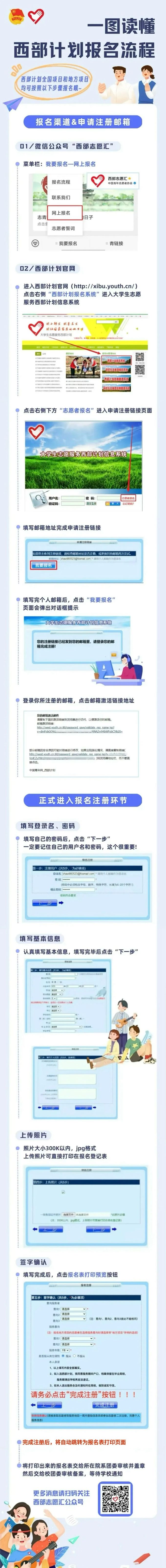 3月1日起至5月上旬,2025年普通高等学校应届毕业生或在读研究生,可通过微信公众号“西部志愿汇”(菜单栏中的“我要报名”)或登录西部计划官方网站(http://xibu.youth.cn),在西部计划报名系统中进行注册报名。